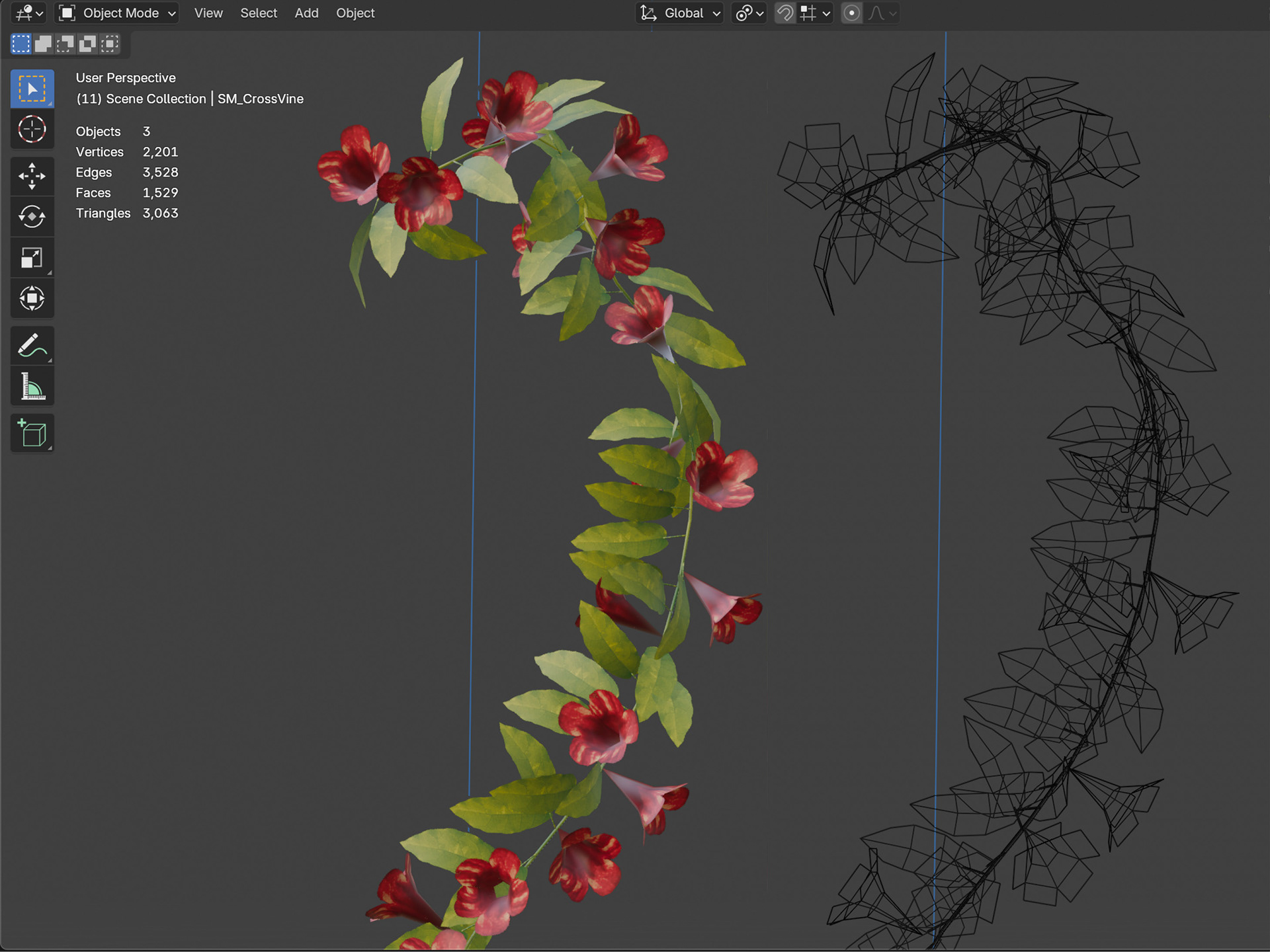 Close-up and wireframe views of a climbing plant generated through a procedural workflow, designed as a VR-optimised low-poly 3D asset.